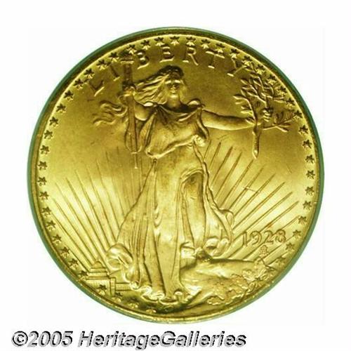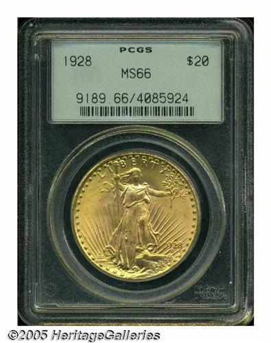 <B>1928<$20> MS66 PCGS.</B></I> A beautiful example with clean surfaces and lovely apricot-gold and olive tints. Potent luster sweeps across the unblemished fields. The highest mintage of any gold issue of any denomination, but of course, millions of pieces met their doom in government furnaces, and almost all among those that survived suffered multiple bagmarks from their loosely stored peers. Housed in an old green label holder.