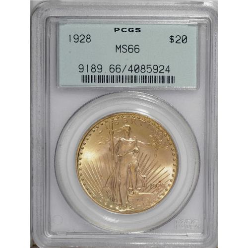 <B>1928 $20 MS66 PCGS.</B></I> A beautiful example with clean surfaces and lovely apricot-gold and olive tints. Potent luster sweeps across the unblemished fields. Despite its mintage, the highest in the history of the denomination, subsequent melting and rough handling reduced the grade of most pieces.<BR><BR><b>Shipping:</b> Coin/Currency (<a target="_blank" href="http://www.heritageauctions.com/common/shipping.php">view shipping information</a>)