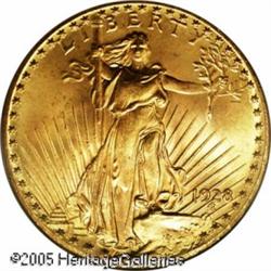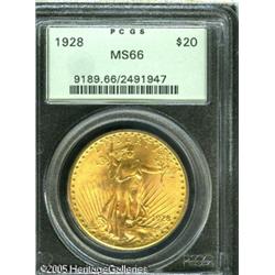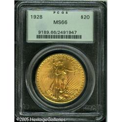 <B>1928 $20 MS66 PCGS.</B></I> The 1928 is undoubtedly one of the best produced Saint-Gaudens twenties. What sets this issue aside from the other P-mints from the 1920s is the exceptional, thick mint luster usually seen on the 1928. This piece is certainly no exception with coppery-red patina as well. Fully struck, there are only the tiniest abrasions present when a magnifier is applied to the surface of this coin. Lot:9757