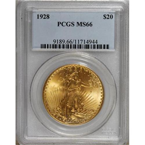 <B>1928 $20 MS66 PCGS.</B></I> Boldly struck with good definition on Liberty's face, fingers, and toes. The eagle is also crisply detailed. Highly lustrous with exquisite lime and peach-gold coloration, this Premium Gem has outstanding eye appeal. A small mark on Liberty's abdomen precludes an even loftier grade designation. <BR><BR><B>Coin Engraver:</B> Augustus Saint-Gaudens<BR><BR><b>Shipping:</b> Coins & Currency (<a target="_blank" href="http://www.heritageauctions.com/common/shipping.php">view shipping information</a>)