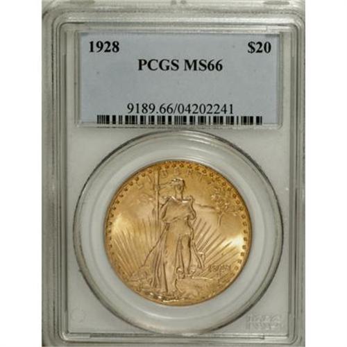 <B>1928 $20 MS66 PCGS.</B></I> A flashy and undeniably appealing sun-gold representative from the highest-mintage double eagle issue in American history. Excellent detail and careful eye appeal combine for spectacular visual appeal. PCGS has graded 65 finer pieces (10/07).<BR><BR><B>Coin Engraver:</B> Augustus Saint-Gaudens<BR><BR><b>Shipping:</b> Coins & Currency (<a target="_blank" href="http://www.heritageauctions.com/common/shipping.php">view shipping information</a>)