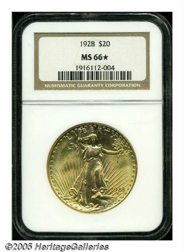 <B>1928<$20> MS66 <S NGC.</B></I> Simply outstanding overall quality, the surfaces show dazzling mint brilliance and the surfaces are virtual perfection. Fully struck as well, this coin is virtually unsurpassable in terms of both eye appeal and overall preservation of surfaces. A must-see coin for the high grade type collector.