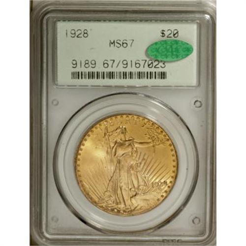 <B>1928 $20 MS67 PCGS. CAC.</B></I> The archetypal Saint-Gaudens double eagle in the ultimate grade, this piece is one of 65 Superb Gems so certified at PCGS, with none finer (12/07). (Interestingly, there are also 65 Superb Gem 1928s certified at NGC, also with none finer.) The marvelous, pristine orange-gold surface simply oozes originality and eye appeal. A couple of small, reddish alloy spots are noted to the right of Liberty's torso. The dot matrix printing on the insert identifies the era in which this coin was certified, undoubtedly not long after PCGS began operations in 1986. Certified in a green-label holder.<BR><BR><B>Coin Engraver:</B> Augustus Saint-Gaudens<BR><BR><b>Shipping:</b> Coins & Currency (<a target="_blank" href="http://www.heritageauctions.com/common/shipping.php">view shipping information</a>)