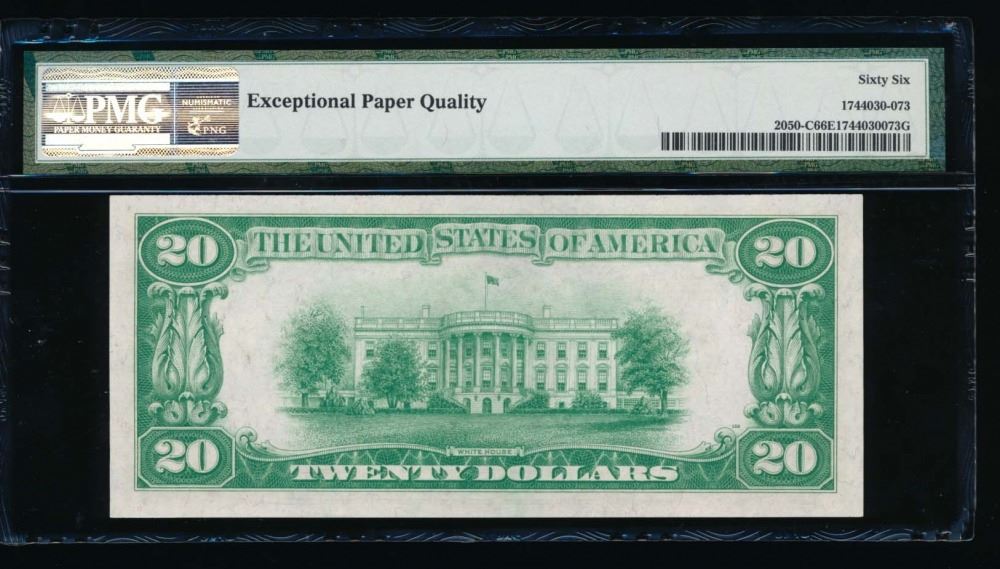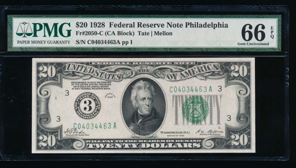 One 1928 $20 Philadelphia Federal Reserve Note PMG 66EPQ.