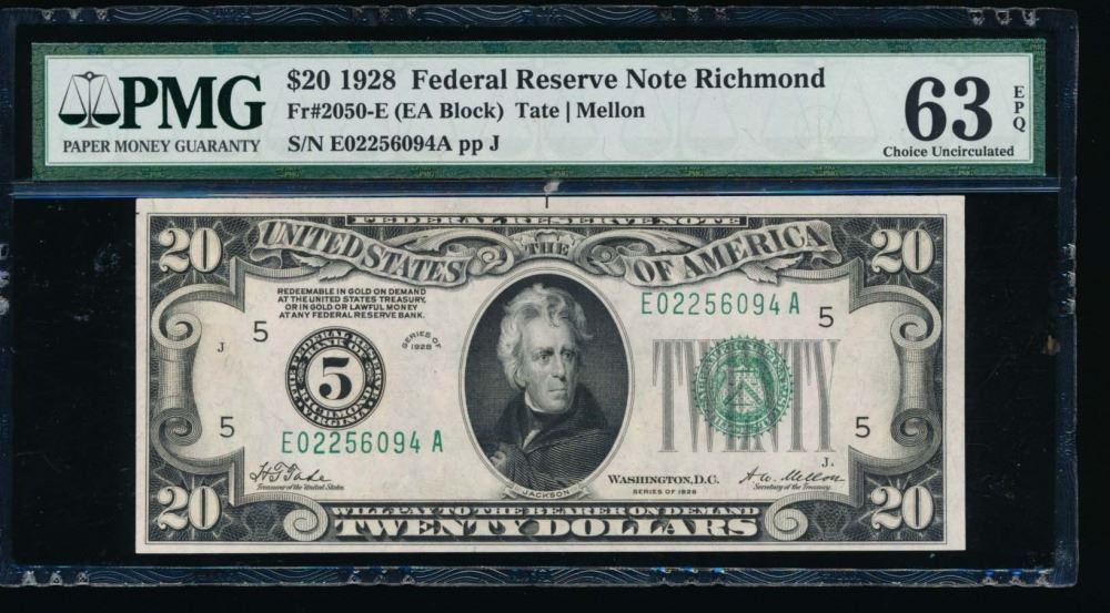 One 1928 $20 Richmond Federal Reserve Note PMG 63EPQ.