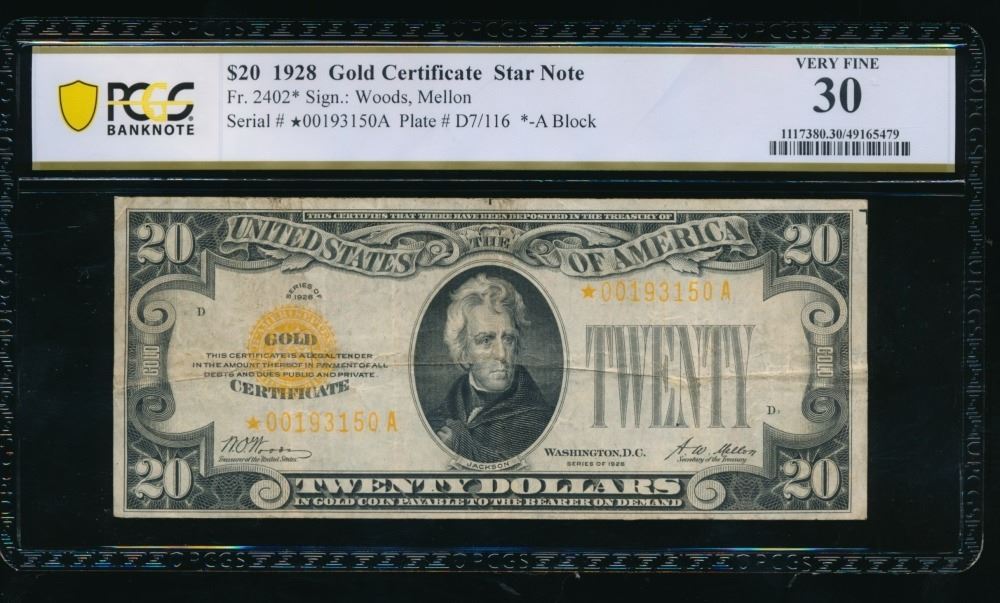 One 1928 $20 STAR Gold Certificate PCGS 30.