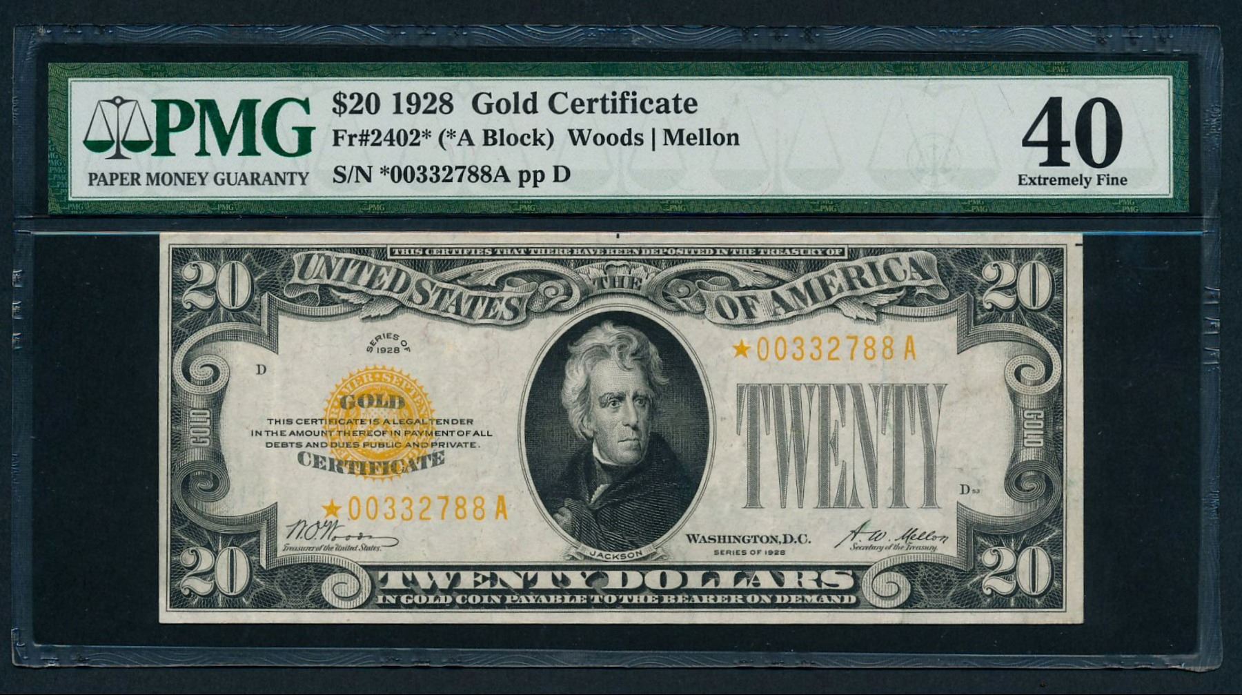 One 1928 $20 STAR Gold Certificate PMG 40.