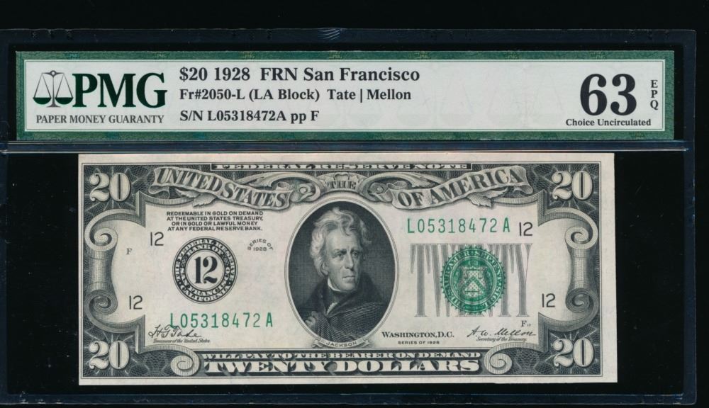 One 1928 $20 San Francisco FRN PMG 63EPQ.
