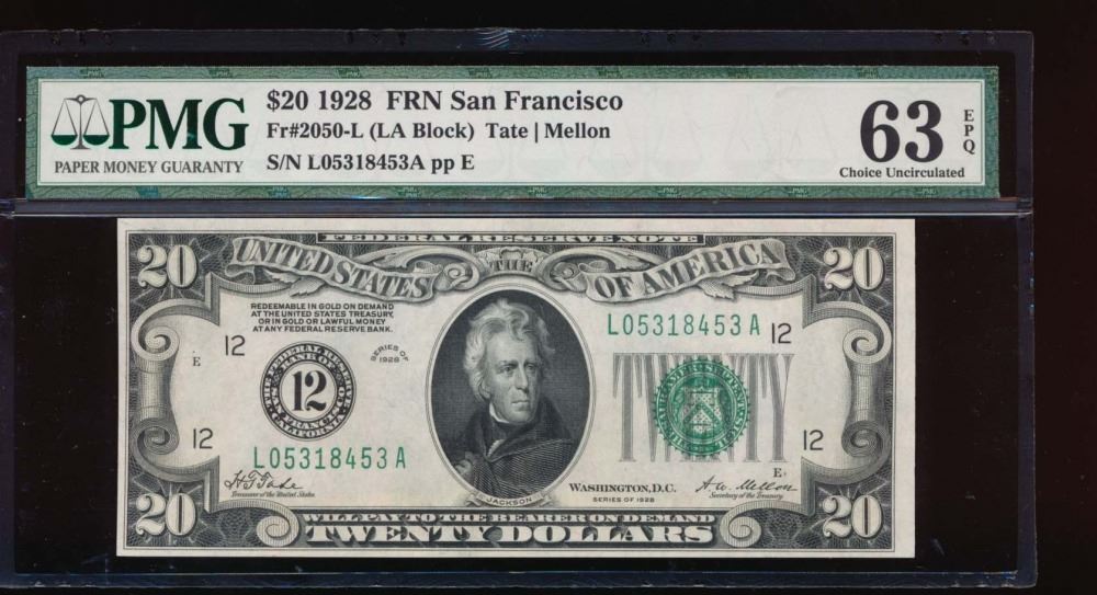 One 1928 $20 San Francisco Federal Reserve Note PMG 63EPQ.