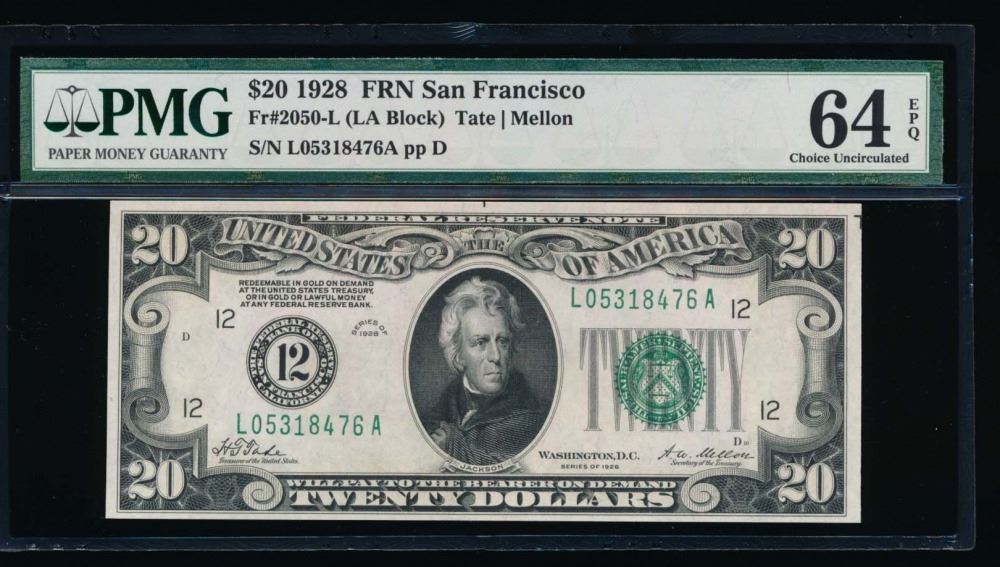 One 1928 $20 San Francisco Federal Reserve Note PMG 64EPQ.