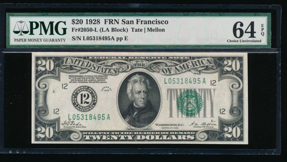 One 1928 $20 San Francisco Federal Reserve Note PMG 64EPQ.