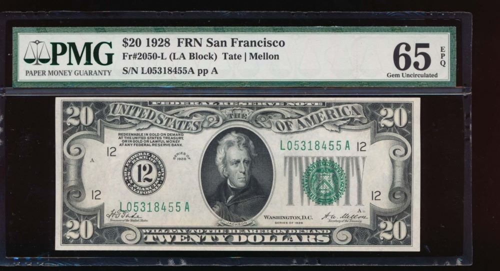 One 1928 $20 San Francisco Federal Reserve Note PMG 65EPQ.