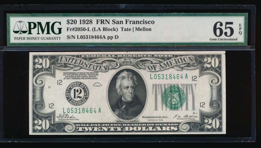 One 1928 $20 San Francisco Federal Reserve Note PMG 65EPQ.