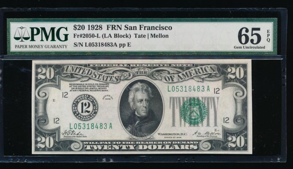 One 1928 $20 San Francisco Federal Reserve Note PMG 65EPQ.
