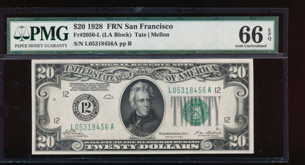 One 1928 $20 San Francisco Federal Reserve Note PMG 66EPQ.