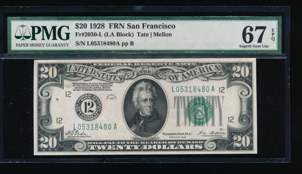 One 1928 $20 San Francisco Federal Reserve Note PMG 67EPQ.