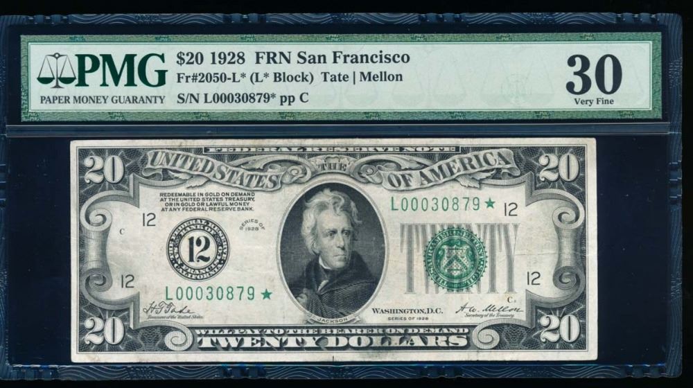 One 1928 $20 San Francisco Federal Reserve Star Note PMG 30.