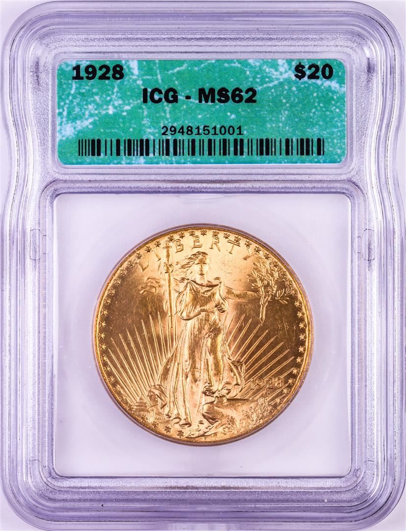 One 1928 $20 St. Gaudens Double Eagle Gold Coin ICG MS62. ICG Certified.