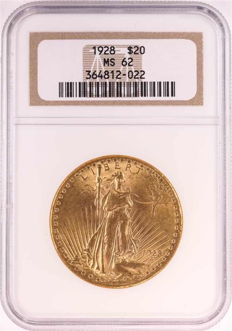 One 1928 $20 St. Gaudens Double Eagle Gold Coin NGC MS62. NGC Certified.