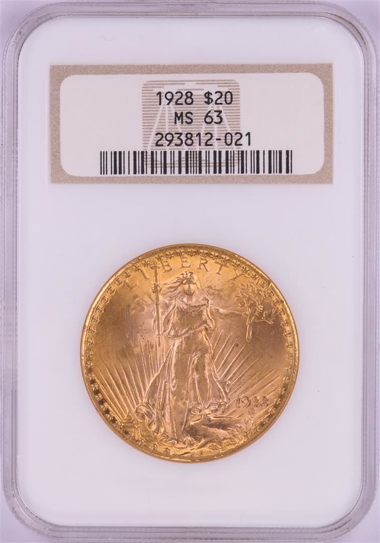 One 1928 $20 St. Gaudens Double Eagle Gold Coin NGC MS63 Old Holder. NGC Certified.