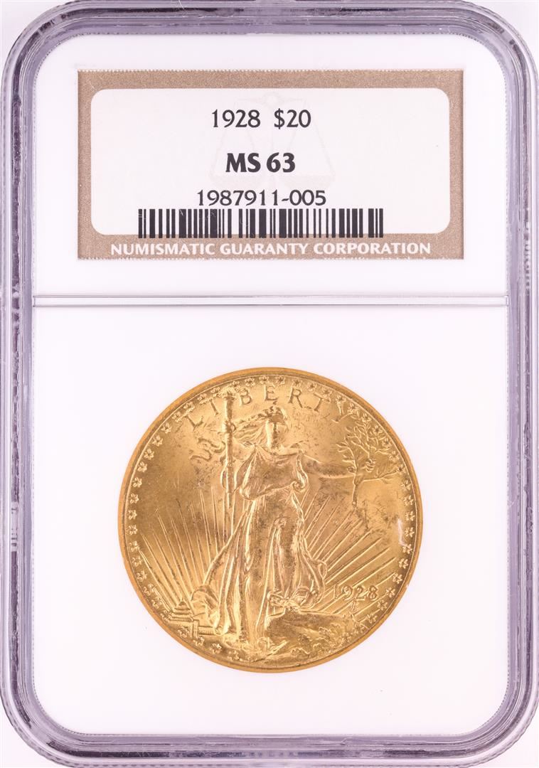 One 1928 $20 St. Gaudens Double Eagle Gold Coin NGC MS63. NGC Certified.