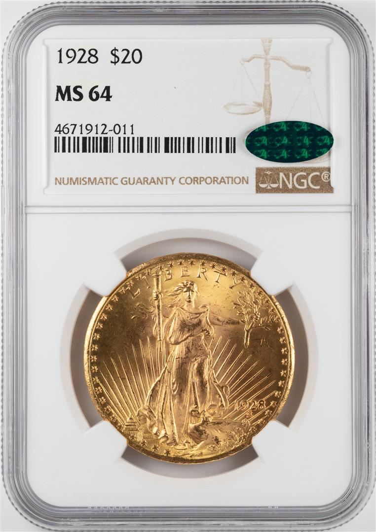 One 1928 $20 St. Gaudens Double Eagle Gold Coin NGC MS64 CAC. NGC Certified.