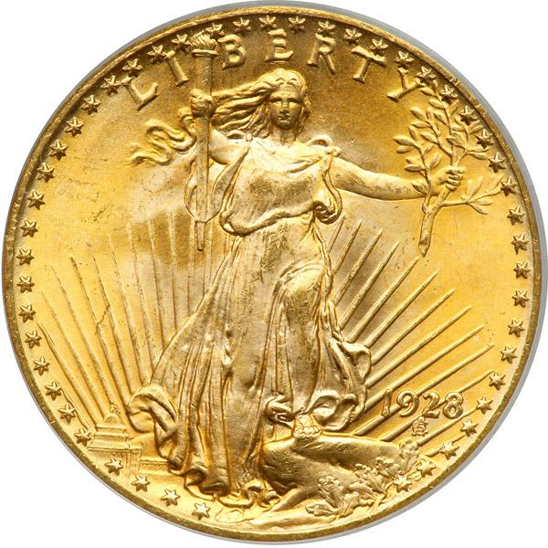 1928 $20 St. Gaudens. PCGS graded MS-66. Lovely golden toning. From an original roll (PCGS # 9189) .