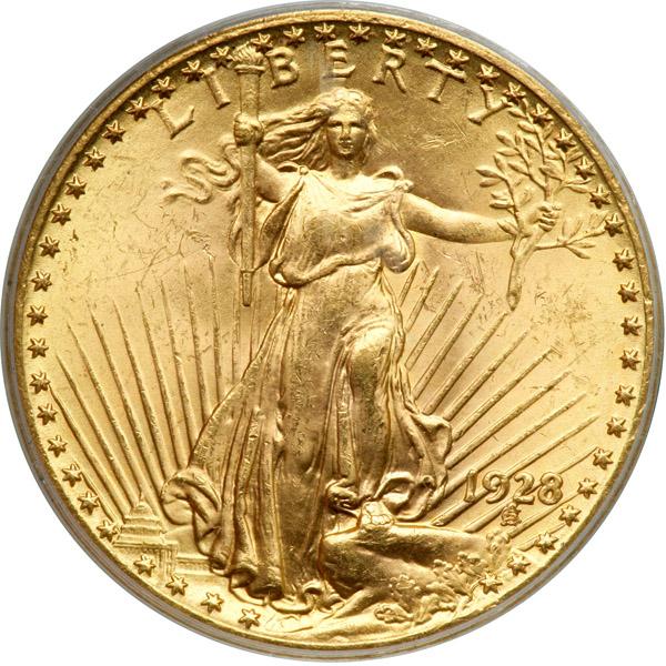 1928. PCGS graded MS-64. Untoned and dancing with fresh golden color, a well struck example of the last easily affordable date. Although the 1929-33 issues were struck in fairly substantial numbers, huge numbers were melted, leaving behind rare dates in all of those subsequent to 1928 (PCGS # 9189) .