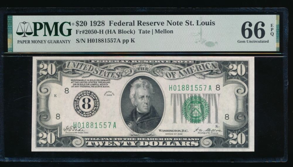 One 1928 $20 St Louis FRN PMG 66EPQ.