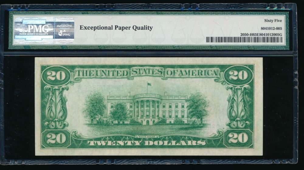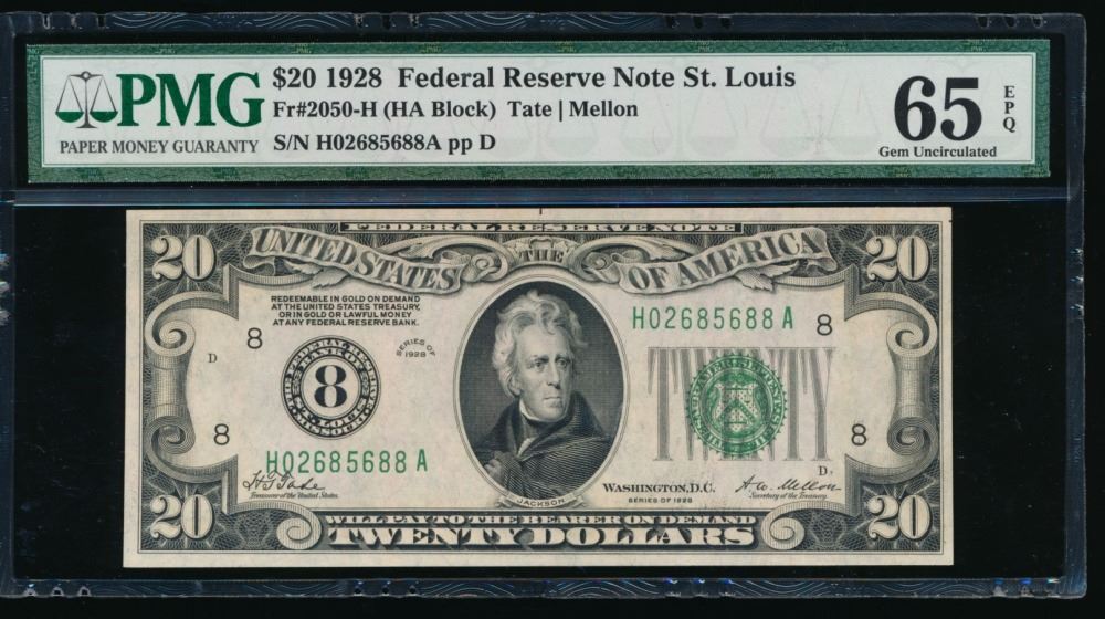 One 1928 $20 St Louis Federal Reserve Note PMG 65EPQ.