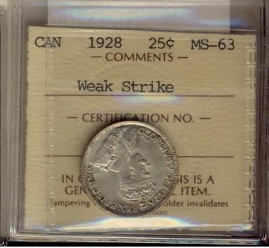 1928 25¢ ICCS MS63. Designated Weak strike. Old ICCS tag.