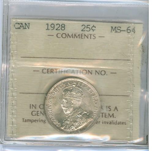 1928 25¢ ICCS MS64. Lustrous white issue.