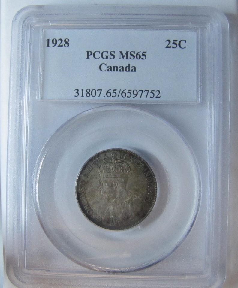 1928 25¢ PCGS MS65. Darker shades and underlying lustre. Scarce in GEM condition.