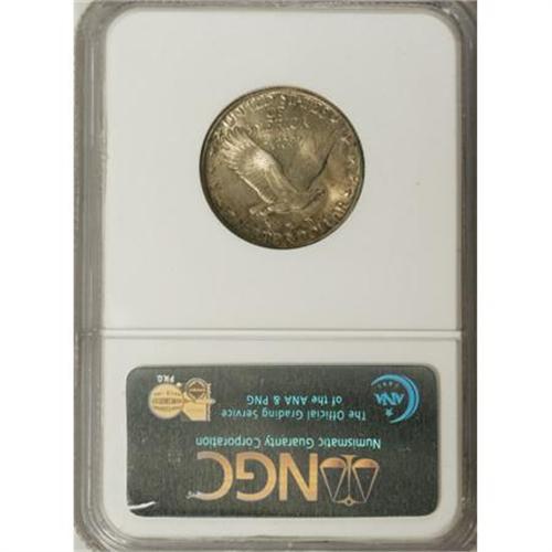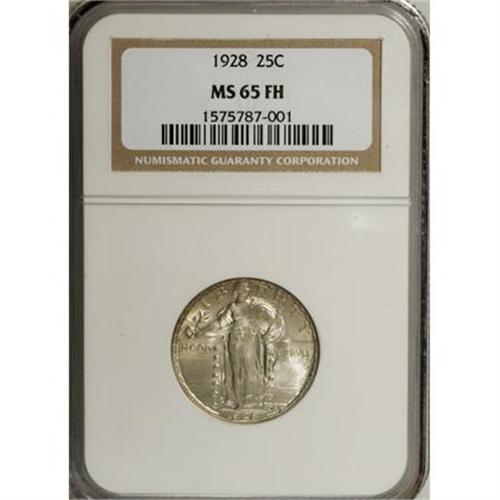 <B>1928 25C MS65 Full Head NGC.</B></I> In addition to the three olive leaves, ear hole, and distinct hairline, Liberty's head displays a faint die crack. This strongly lustrous Gem has faint golden toning at the obverse peripheries and reddish-orange patina in the regions below the eagle's outstretched wings. Census: 44 in 65 Full Head, 23 finer (8/07).<BR><BR><B>Coin Engraver:</B> Hermon A. MacNeil<BR><BR><b>Shipping:</b> Coins & Currency (<a target="_blank" href="http://www.heritageauctions.com/common/shipping.php">view shipping information</a>)