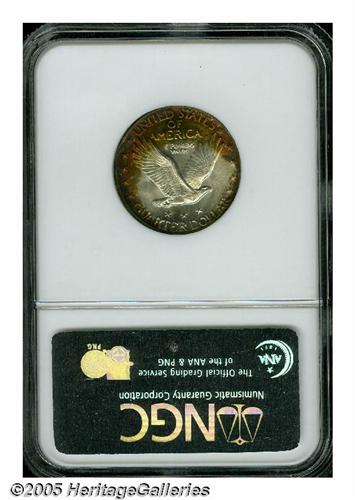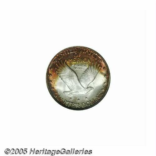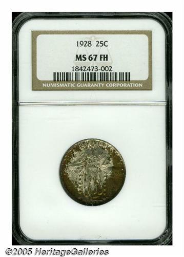 <B>1928<25C> MS67 Full Head NGC.</B></I> There are Superb Gems and then there are unequivocal, wholly original Superb Gems, this being solidly in the latter category. The strike is every bit as sharp as one expects of the Full Head designation and ellipses of near-brilliance are surrounded by beautiful coppery-gold and olive-green iridescence. Lustrous surfaces are virtually devoid of any significant contact marks. Population: 8 in 67, 2 finer (6/05).