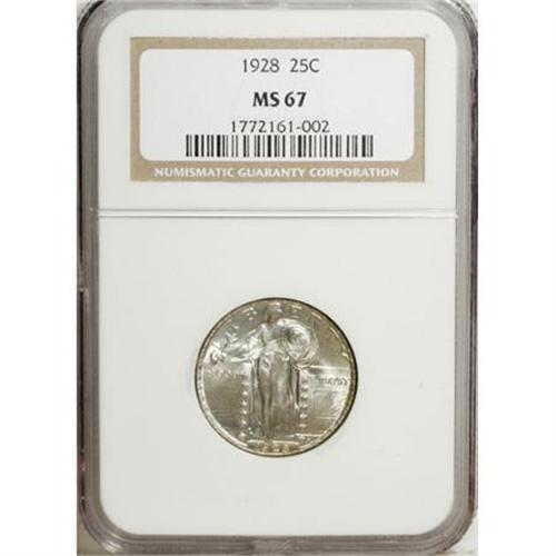 <B>1928 25C MS67 NGC.</B></I> While not completely struck up on Liberty's head, that is the only deficiency on this Superb coin. Pale iridescent toning graces the strongly lustrous surfaces of this outstanding piece, a wonderful representative of this popular type issue. Census: 13 in 67, 0 finer (6/07).<BR><BR><B>Coin Engraver:</B> Hermon A. MacNeil<BR><BR><b>Shipping:</b> Coins & Currency (<a target="_blank" href="http://www.heritageauctions.com/common/shipping.php">view shipping information</a>\)