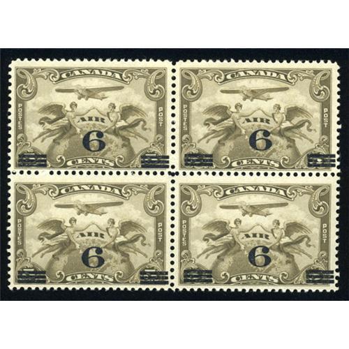 <Our item number 138683><B>1928/30, Airmails. Scott <B>C1, C2</B>. Unitrade C1, C2; C$200.</B> Fresh blocks of four with the bottom pair in NH condition. Block of 4. LH/NH. <B>F.-V.F.</B> <BR>Estimated Value $100 - 150. <BR><BR>Our item number 138683<BR><IMAGES><P ALIGN="CENTER"><IMG SRC="http://www.goldbergcoins.net/liveauction/49jpegs/138683.jpg"> </P></IMAGES>