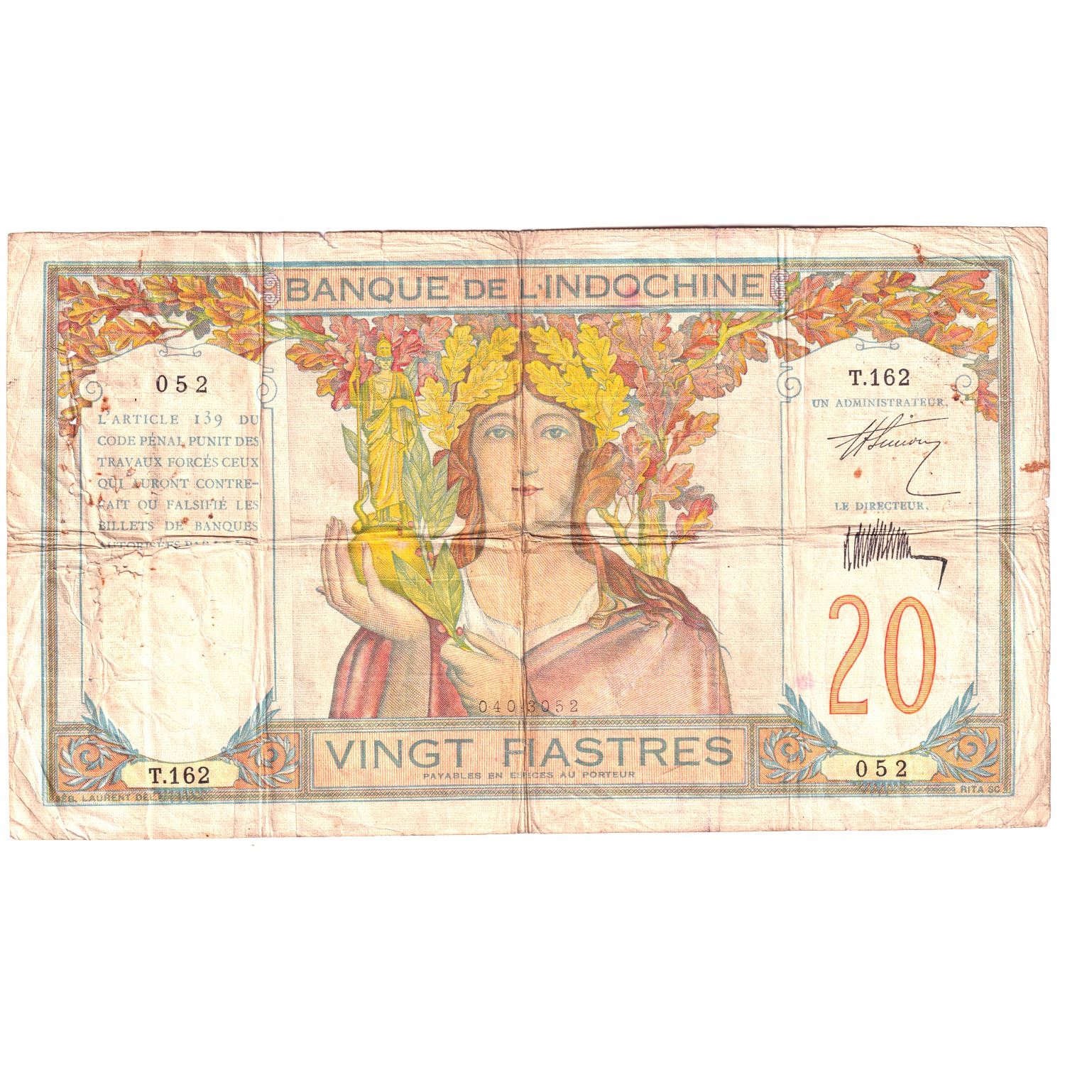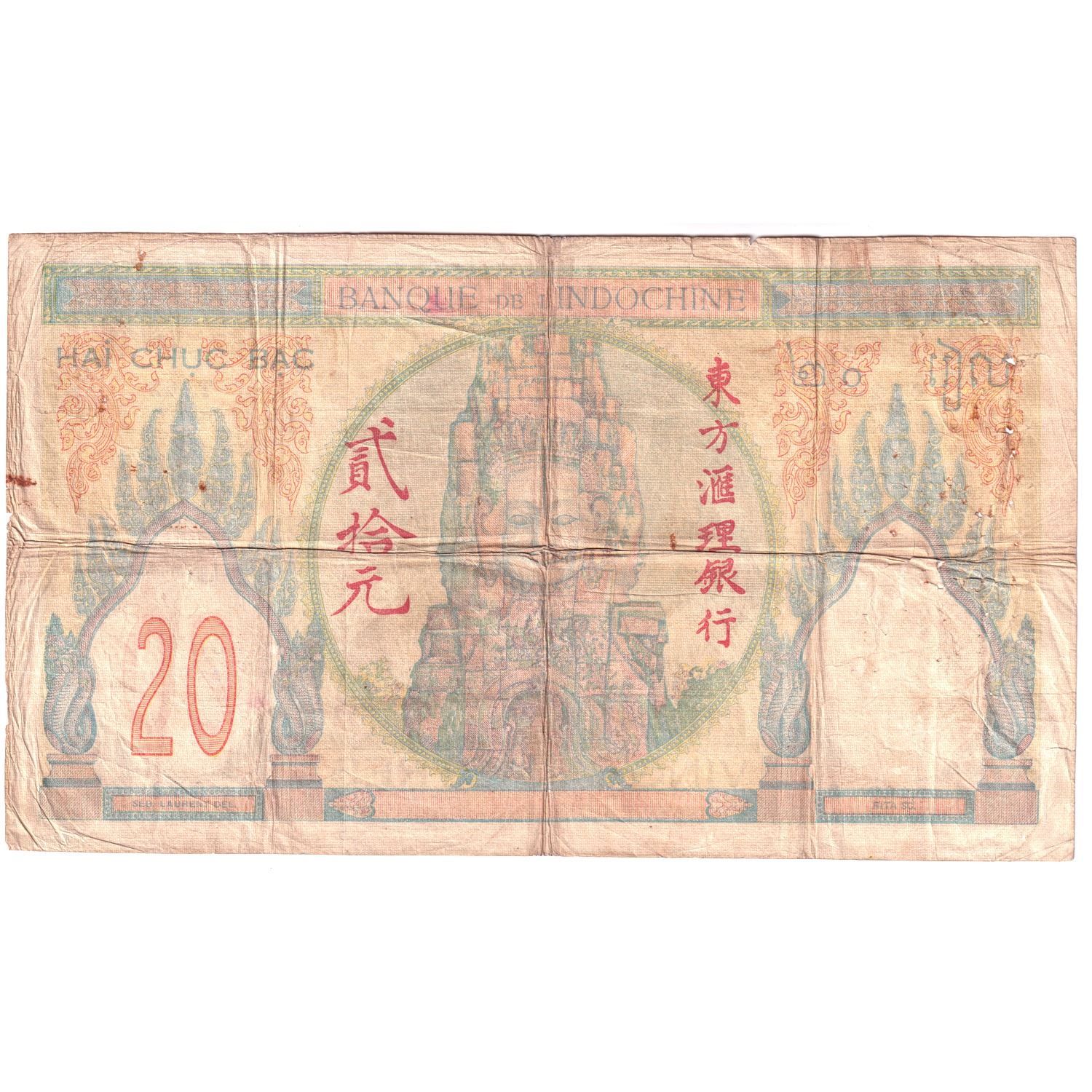 1928-31 Indochina 20 Piastres, Sig 7, Fine (Damage)