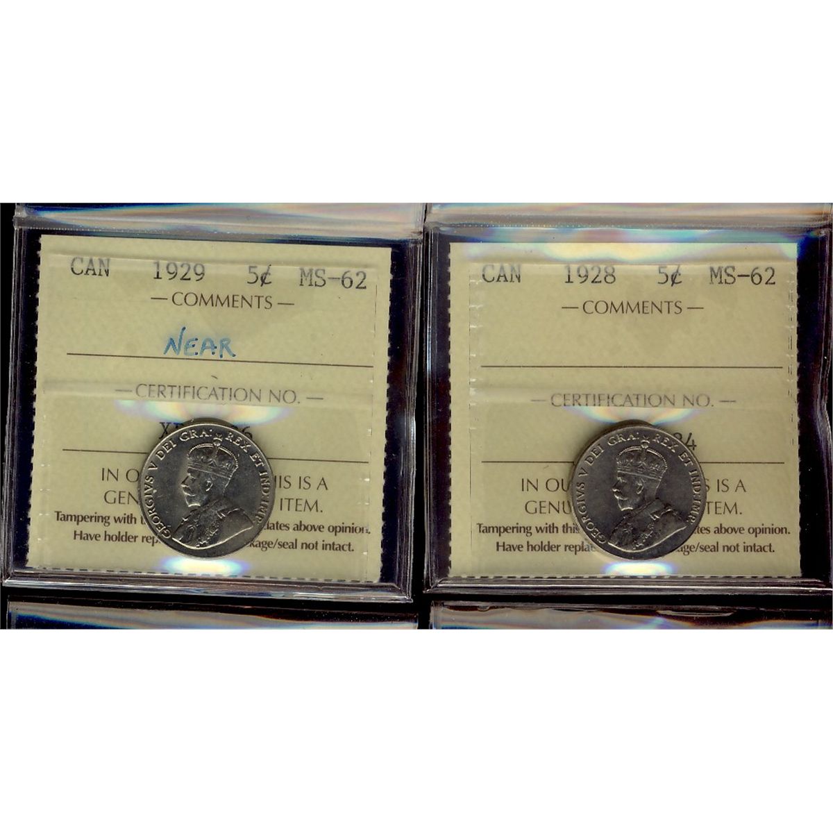 1928 5¢ & 1929 Nr ICCS MS62. Lot of 2 coins.