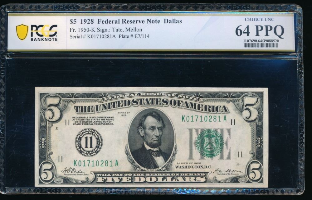One 1928 $5 Dallas FRN PCGS 64PPQ.