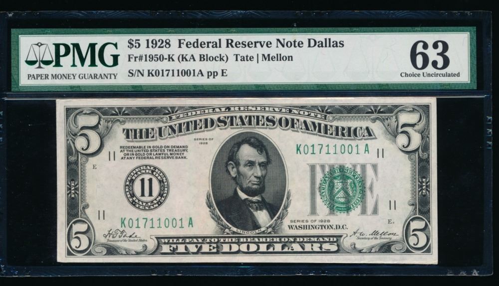 One 1928 $5 Dallas FRN PMG 63.
