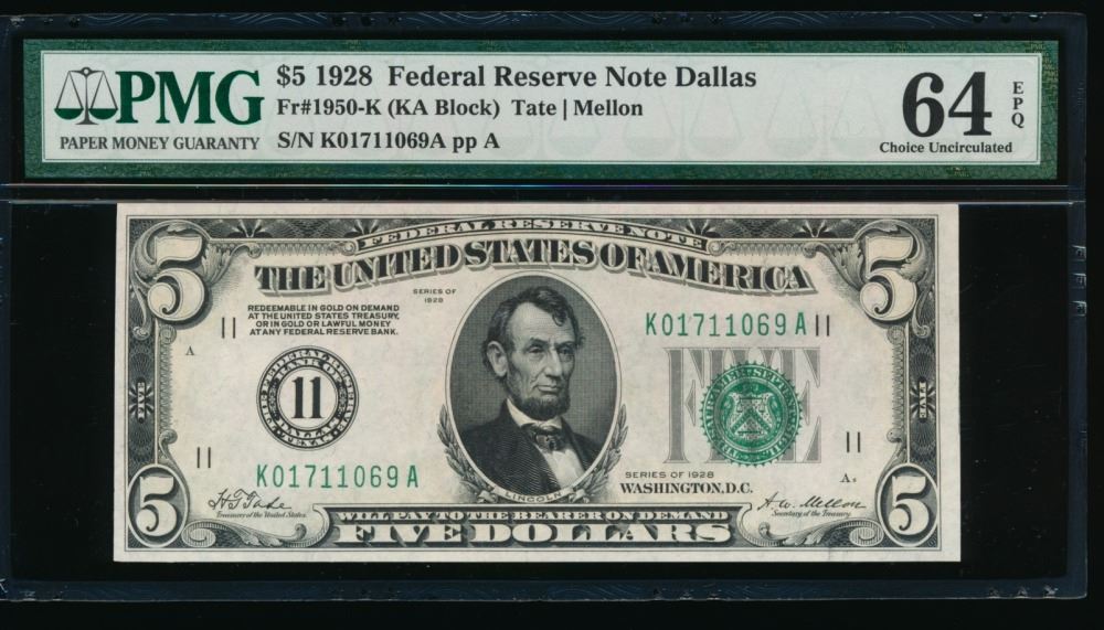 One 1928 $5 Dallas FRN PMG 64EPQ.