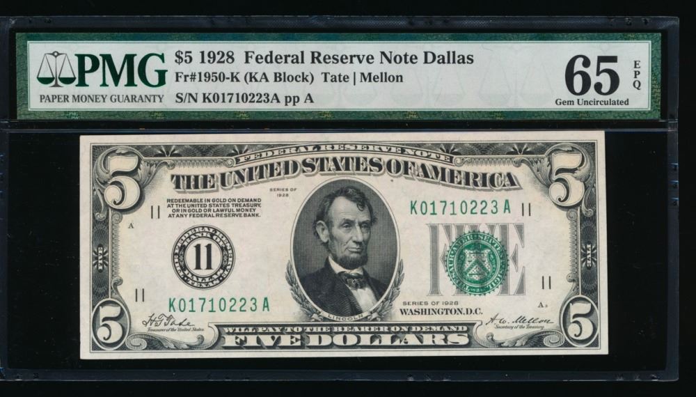 One 1928 $5 Dallas FRN PMG 65EPQ.