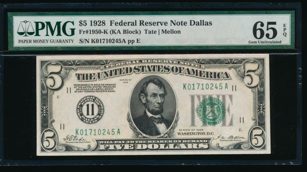 One 1928 $5 Dallas FRN PMG 65EPQ.