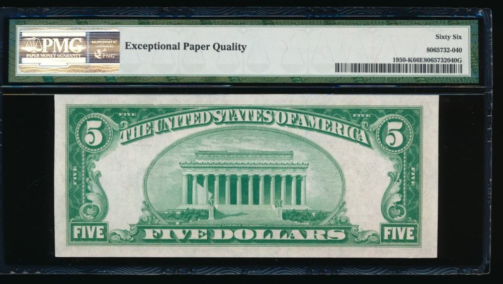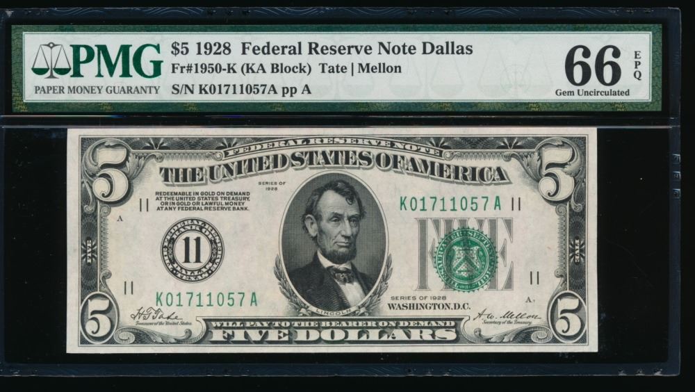 One 1928 $5 Dallas FRN PMG 66EPQ.