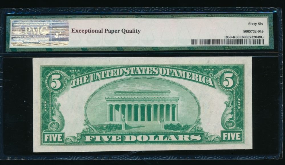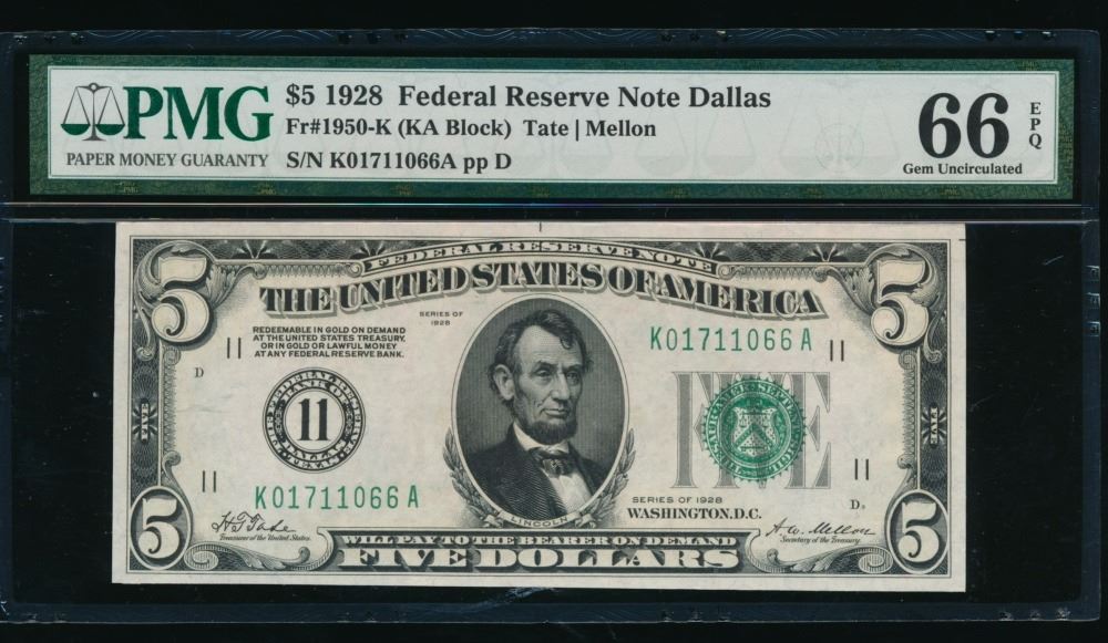 One 1928 $5 Dallas FRN PMG 66EPQ.