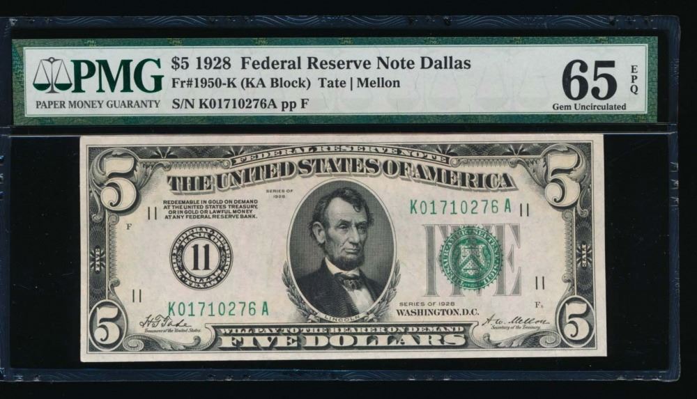 One 1928 $5 Dallas Federal Reserve Note PMG 65EPQ.