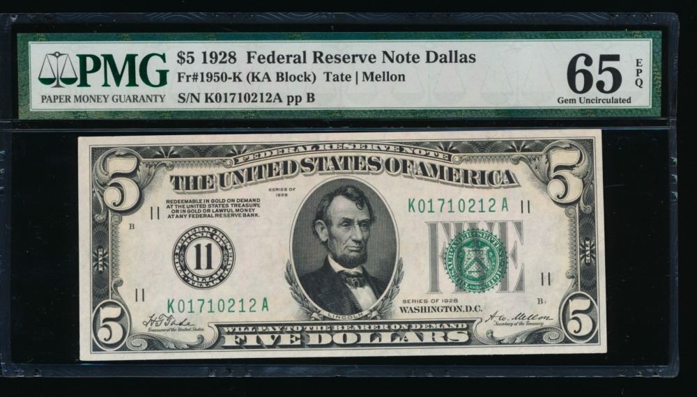 One 1928 $5 Dallas Federal Reserve Note PMG 65EPQ.