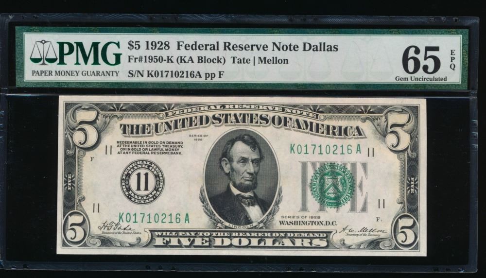 One 1928 $5 Dallas Federal Reserve Note PMG 65EPQ.