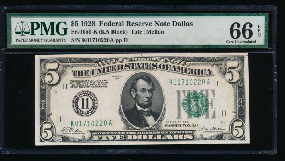 One 1928 $5 Dallas Federal Reserve Note PMG 66EPQ.